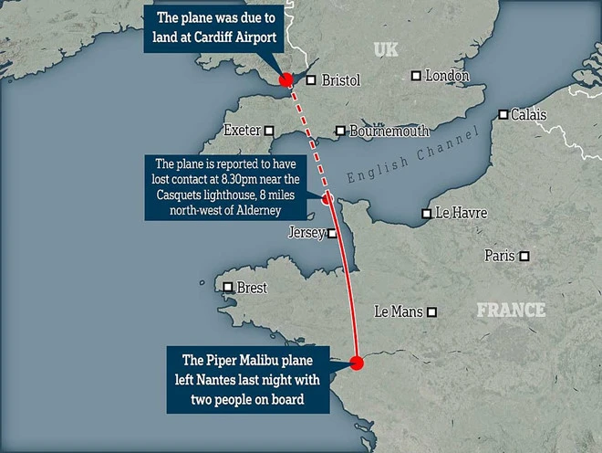 Lộ trình bay từ Nantes sang Cardiff, "chấm tròn đỏ" giữa là vị trí mất liên lạc và biến mất trên radar