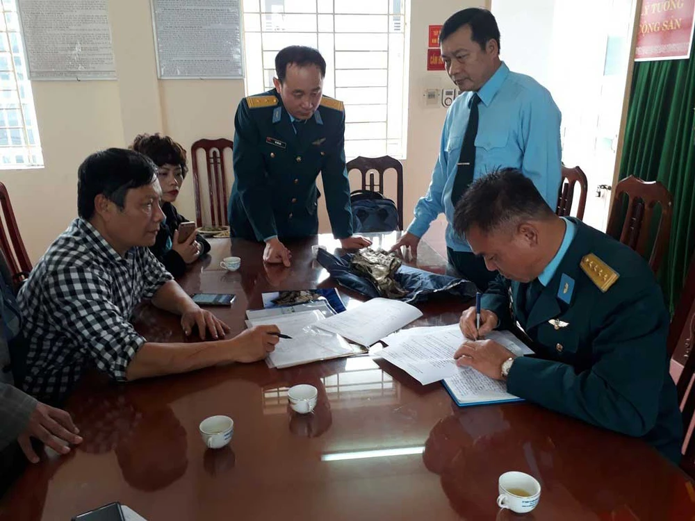 Đại diện Quân chủng Phòng không không quân ký biên bản bàn giao mảnh vỡ máy bay do TS Nguyễn Lê Anh chuyển tới. Ảnh: TUYẾN PHAN