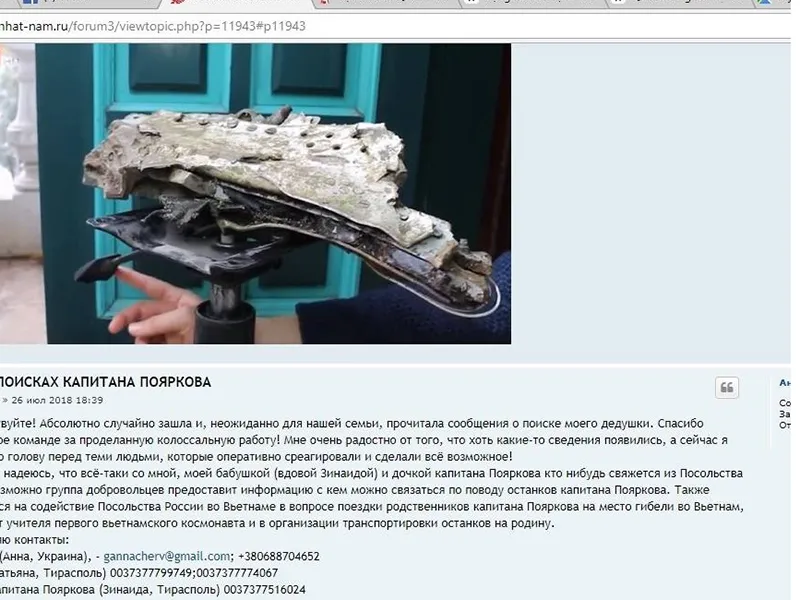 | Lá thư đến từ Ukraina Xin chào! Hoàn toàn tình cờ tôi… đã đọc thông tin về việc tìm kiếm ông tôi… Nay tôi xin cúi đầu cảm tạ trước những người đã kịp thời đáp ứng và làm tất cả những gì có thể! Tôi rất hy vọng ai đó từ sứ quán hay từ nhóm tình nguyện liên lạc với tôi, bà tôi (bà quả phụ Zinaida) và con gái của Đại úy Poyarkov để cung cấp thông tin… về hài cốt Đại úy Poyarkov. Chúng tôi cũng hy vọng sự giúp đỡ của sứ quán Nga tại Việt Nam về chuyến đi của những người thân Đại úy Poyarkov đến Việt Nam… và trong việc tổ chức vận chuyển hài cốt về Tổ quốc. Cháu: Anna Poyarkova, ở Ukraina (Trích thư ngỏ của Anna Poyarkova, |