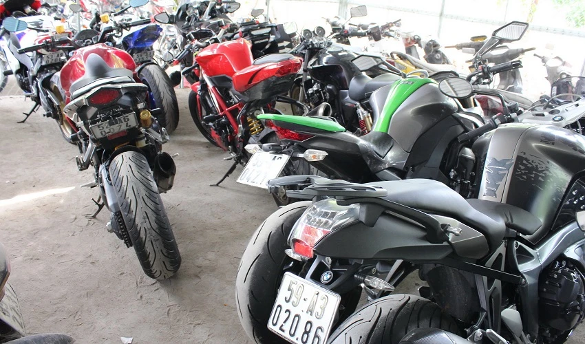 Chín mô tô đua phân khối lớn mang biển số TP.HCM (trong đó có mô tô 59A3-01159 gây tai nạn) đang bị tạm giữ tại nhà tạm giữ phương tiện của Công an huyện Ninh Sơn. Ảnh: M.TRÂN