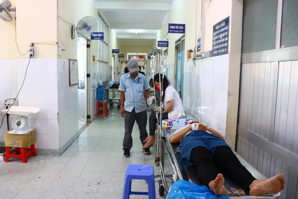 Số lượng công nhân nhập viện quá nhiều nên phải nằm truyền nước ngoài hành lang.