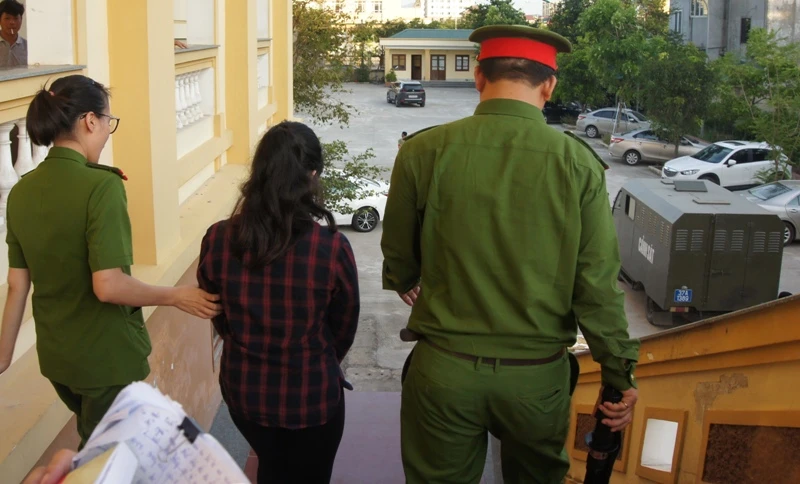 Cảnh sát dẫn giải bị cáo Nguyễn Thị Lam lên xe bịt thùng chở về trại tạm giam Công an tỉnh Nghệ An.