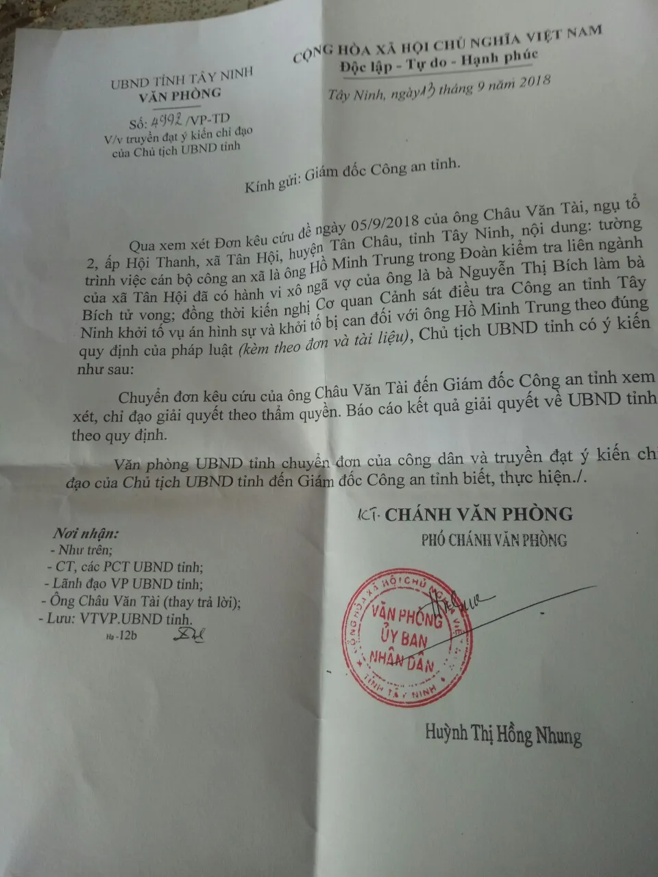 Chiều 21-9, gia đình nạn nhân Nguyễn Thị Bích ở ấp Hội Thanh, xã Tân Hội, huyện Tân Châu, Tây Ninh cho biết vừa nhận được văn bản truyền đạt ý kiến chỉ đạo của chủ tịch UBND tỉnh Tây Ninh đối với giám đốc Công an tỉnh liên quan đến cái chết của bà Bích.