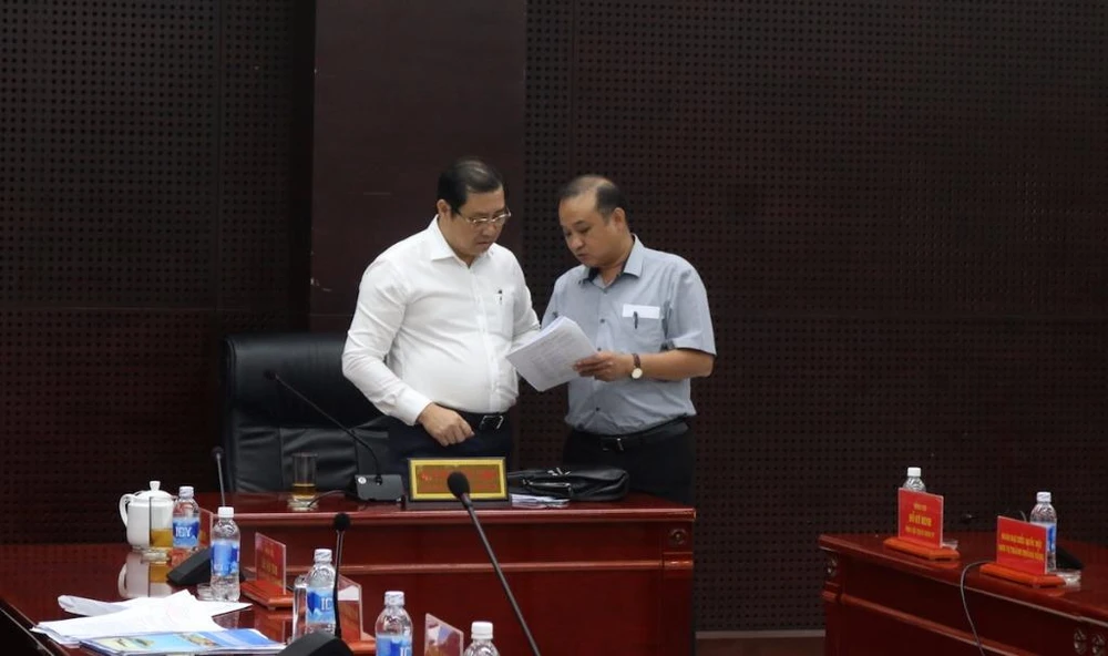 Ông Huỳnh Đức Thơ (Chủ tịch UBND TP Đà Nẵng) trao đổi với ông Lê Quang Nam (Giám đốc Sở TN&MT) về vấn đề xử lý nước thải, ô nhiễm môi trường. Ảnh: NĐ