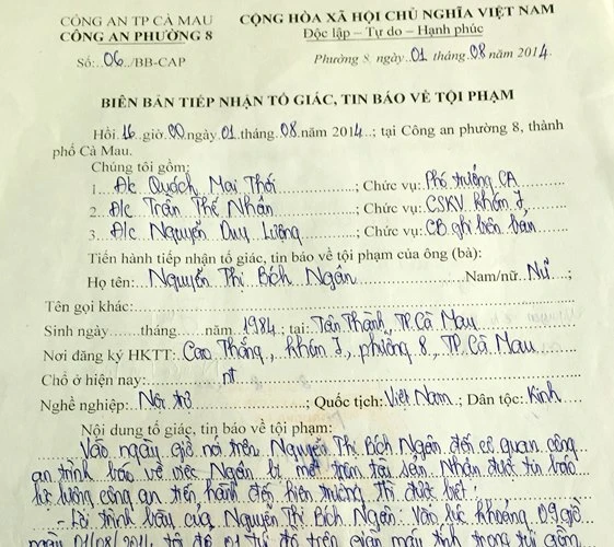 Nội dung biên bản thể hiện, lúc 16 giờ chiều ngày 1-8-2014, chị Ngân đến trụ sở Công an phường 8, TP Cà Mau trình báo vụ việc mất một số nữ trang là của hồi môn của nhà chồng và cha mẹ ruột vừa cho sau đám cưới, gồm nhiều vòng, dây chuyền, nhẫn… trọng lượng khoảng 5 lượng.