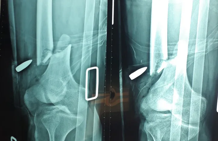 Kết quả chụp X-quang cho thấy anh T. bị gãy xương đùi phải. Ảnh: BVCC