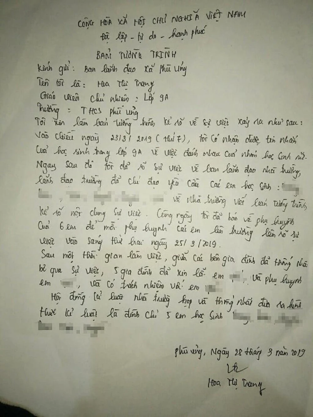 Nguyên văn tường trình của giáo viên Hoa Thị Trang viết: "Tôi xin làm bản tường trình kể rõ sự việc xảy ra như sau: Vào chiều ngày 23-3-2019 (thứ 7), tôi có nhận được tin nhắn của học sinh trong lớp 9A về việc đánh nhau của nhóm học sinh nữ.
