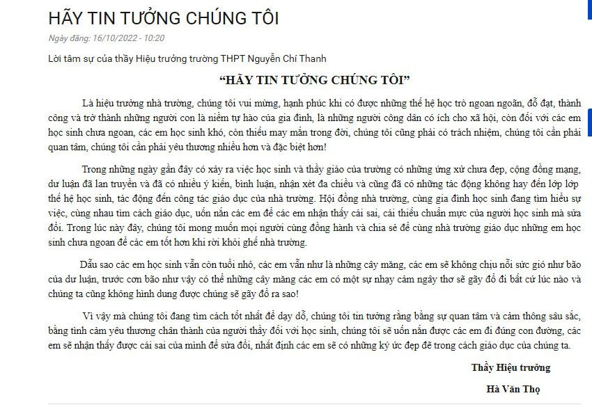 Theo vị hiệu trưởng này, trong những ngày gần đây, sự việc học sinh và thầy giáo của trường có những ứng xử chưa đẹp. Cộng đồng mạng, dư luận đã lan truyền và đã có nhiều ý kiến, bình luận, nhận xét đa chiều và cũng đã có những tác động không hay các thế hệ học sinh cũng như công tác giáo dục của nhà trường.
