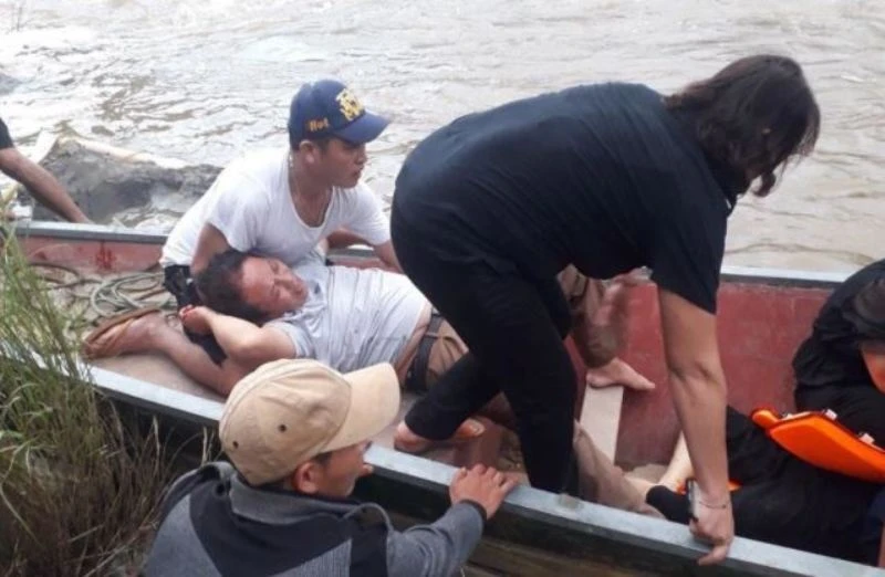 Bộ đội Biên phòng và người dân dùng xuồng đưa nạn nhân theo dòng sông đi ra trạm xá cấp cứu.