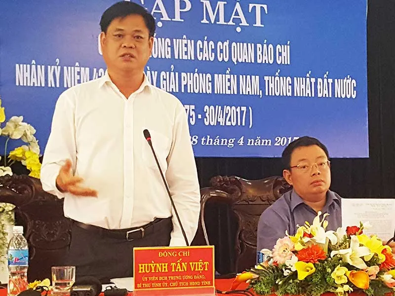 Ông Huỳnh Tấn Việt, Bí thư Tỉnh ủy (đứng)và ông Hoàng Văn Trà, Chủ tịch UBND tỉnh Phú Yên, trao đổi với báo chí về các dự án liên quan đến phá rừng. Ảnh: TẤN LỘC