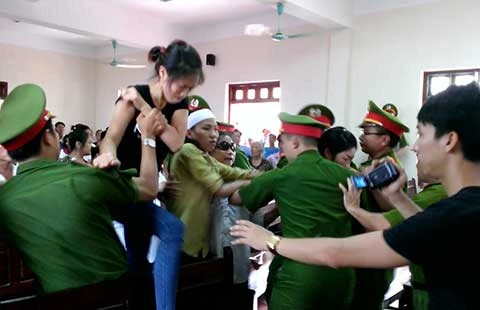 Người nhà nạn nhân gây náo loạn phiên tòa sau khi HĐXX công bố mức án của các bị cáo. Ảnh: T.PHAN