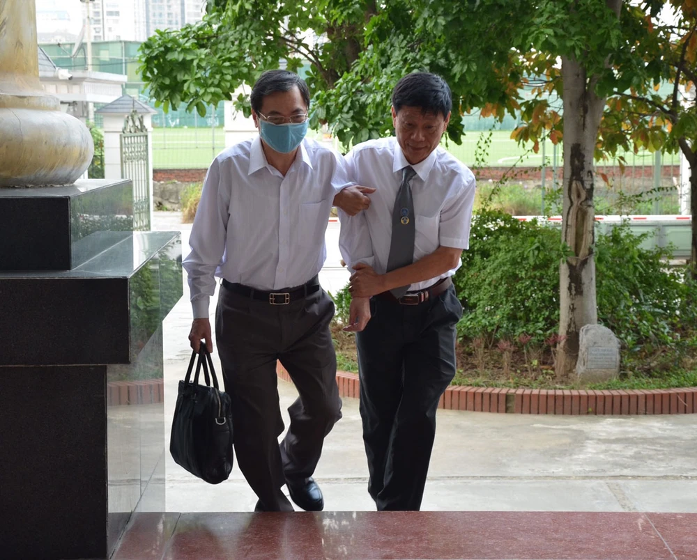 Cựu bộ trưởng Vũ Huy Hoàng được dìu từng bước vào phòng xử án. Ảnh: TP