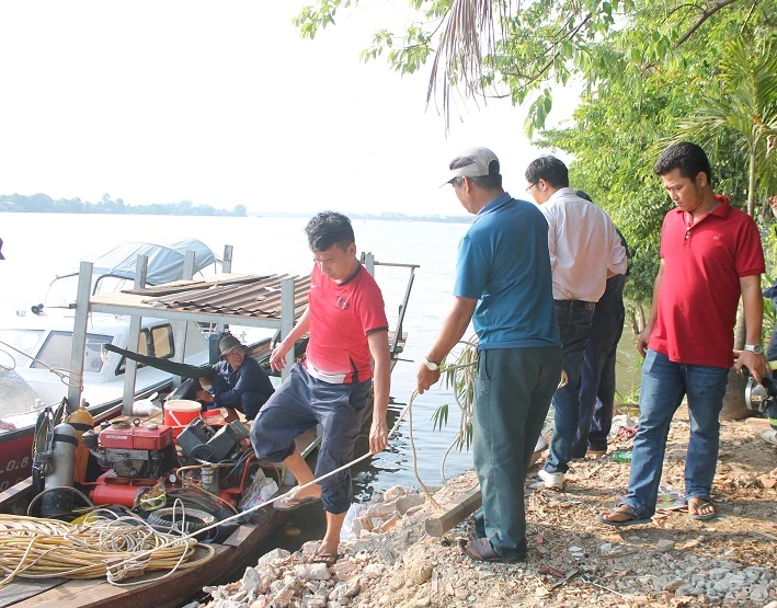 Nhóm thợ lặn ra hiện trường để tìm kiếm đầu đẩy của chiếc sà lan. Ảnh: Vũ Hội.