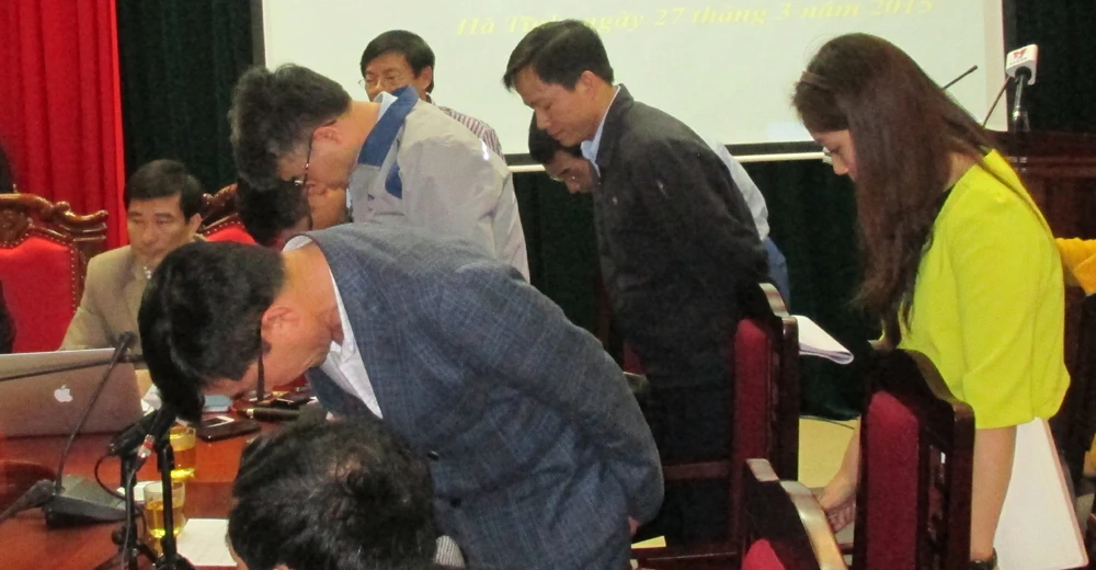 Tại buổi họp báo vụ sập giàn giáo (Ban tuyên giáo Tỉnh ủy Hà Tĩnh tổ chức sáng 27-3), Đại diện Formosa Hà Tĩnh (chủ đầu tư) và Công CP Samsung C&T (thuộc tập đoàn Samsung, nhà thầu thi công công trình) đã cúi đầu xin lỗi về việc để xảy ra sự cố sập giàn giáo đau lòng. Ảnh: ĐẮC LAM