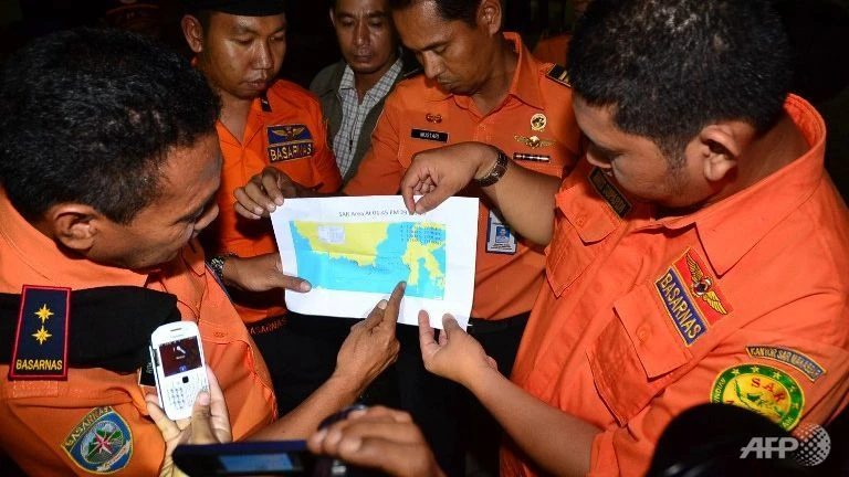 Các thành viên trong lực lượng cứu hộ đang xác định vị trí của nạn nhân chuyến bay QZ8501 trên bản đồ (Nguồn: AFP)