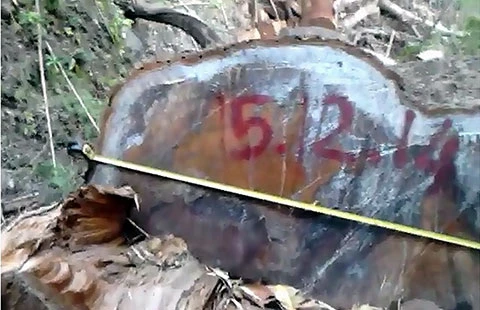 Điều đặc biệt là trên gốc cây dầu cổ thụ này vẫn còn màu sơn đỏ của lực lượng bảo vệ rừng. Căn cứ vào số ký hiệu đánh dấu, gốc cây này được bảo vệ rừng phát hiện vào ngày 15-12-2014.