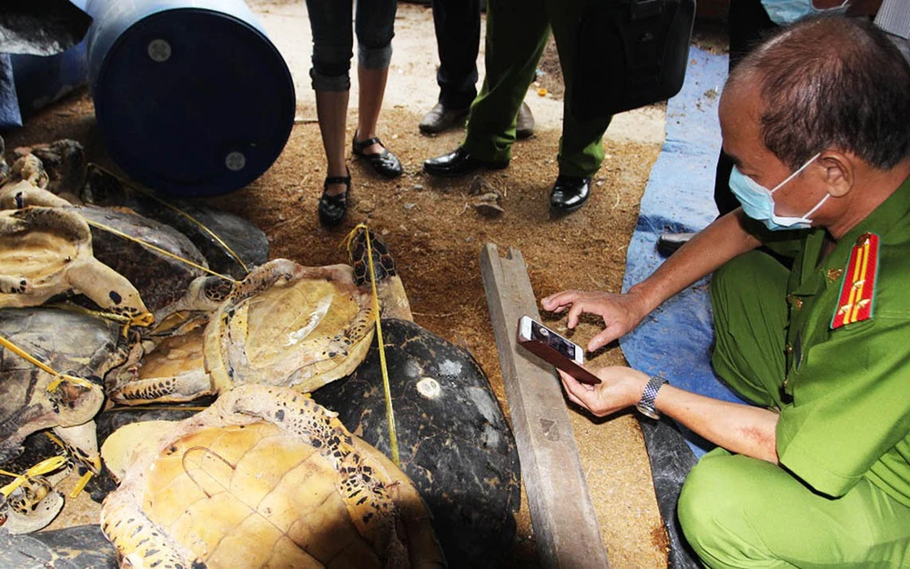 Cơ quan điều tra khám nghiệm hiện trường vụ tàng trữ rùa biển.