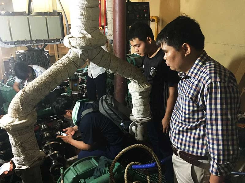 Thành viên tổ thẩm định độc lập kiểm tra một máy tàu do Công ty TNHH MTV Nam Triệu đóng bị hỏng nặng. Ảnh: TL