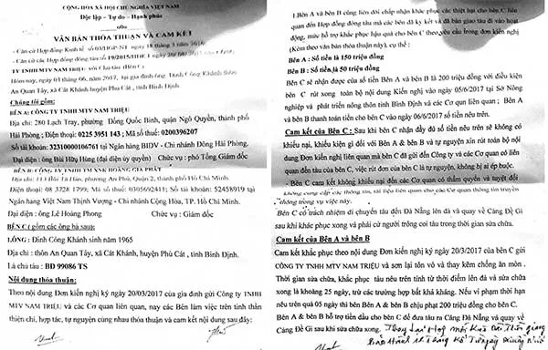 Trong khi đó, các đơn vị đóng tàu là Công ty Nam Triệu, Công ty Đại Nguyên Dương lại có những động thái khác. Theo tài liệu PV có được, Công ty Nam Triệu đã soạn sẵn “văn bản thỏa thuận và cam kết” với nội dung chi tiền cho ngư dân để họ rút đơn khiếu nại, không cung cấp thông tin cho truyền thông.
