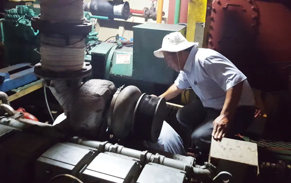 Thành viên tổ thẩm định độc lập kiểm tra một máy tàu do Công ty TNHH MTV Nam Triệu đóng bị hỏng nặng. Ảnh: TL