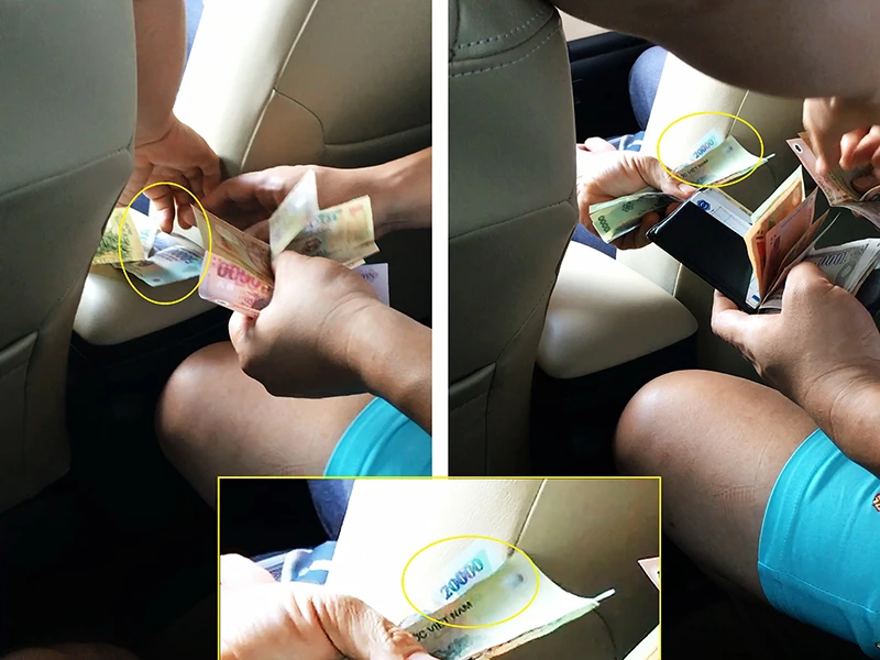Tài xế taxi giả tráo tờ tiền 500.000 đồng thành tờ 20.000 đồng. Ảnh: N.TÂN