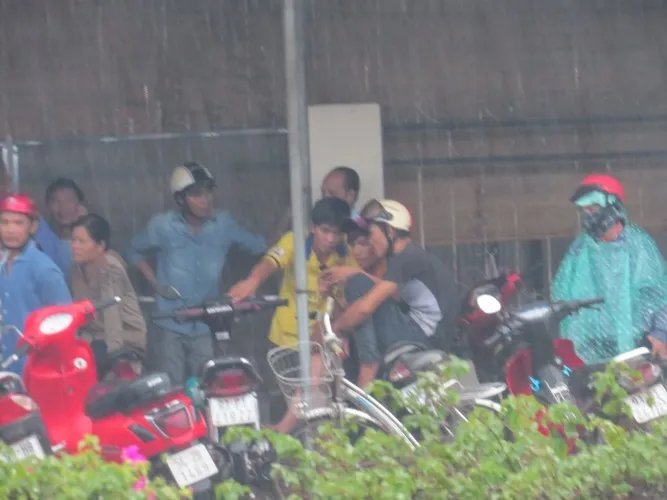 Trời mưa to cũng không ngăn được dòng người hiếu kỳ đổ về xem. Ảnh: Hồng Trâm