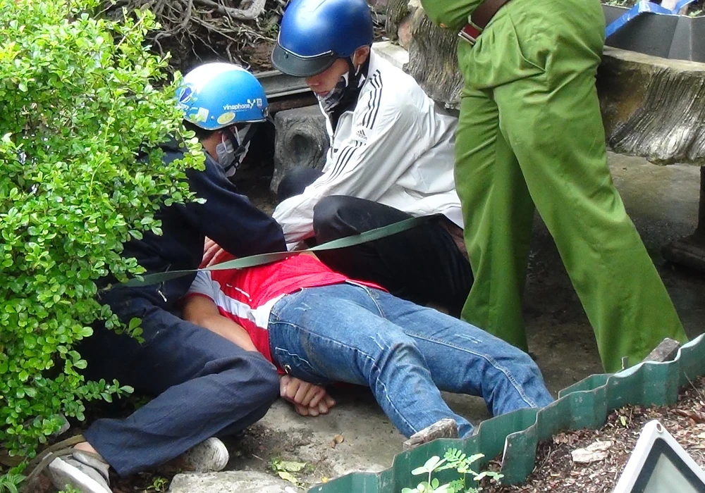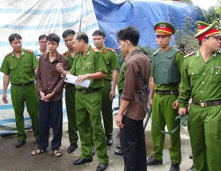 Dương và Tiến diễn lại hành vi tội ác tại buổi thực nghiệm hiện trường.