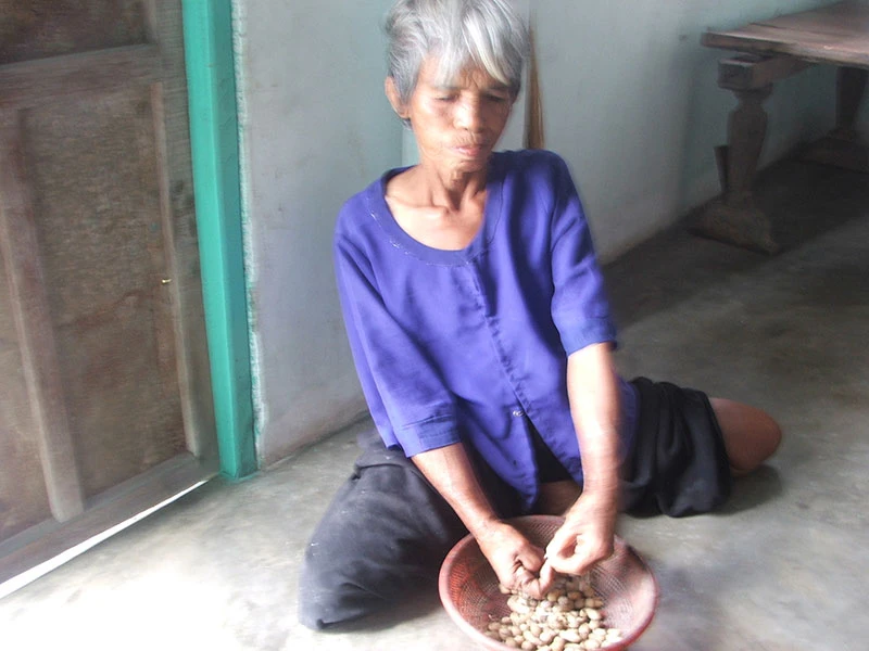 Để đỡ đần chị, người đàn bà tàn tật hơn 70 tuổi này còn nhận đậu phộng (lạc) về nhà lột vỏ cân ký tính tiền. Mỗi ký đậu phộng lột xong vỏ bà được trả 1.000 đồng và mỗi ngày bà vẫn cố gắng đều đặn kiếm được 8.000-9.000 đồng.