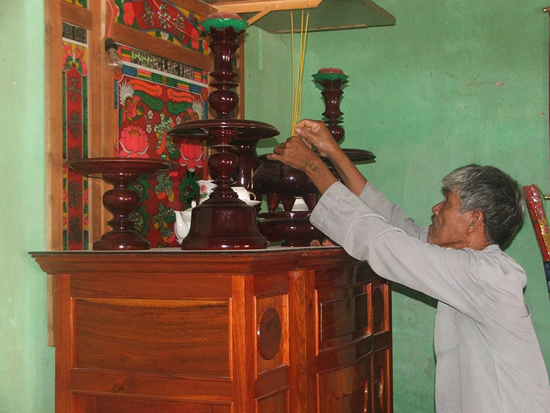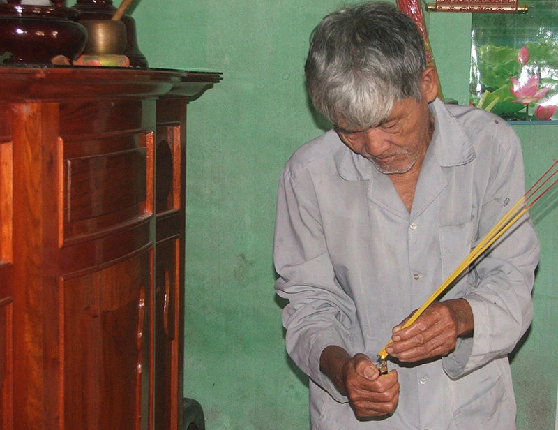 Ông Sáu Thời thắp nhang tưởng nhớ toàn bộ gia đình mình đã bỏ mạng trong vụ thảm sát tang thương. Ảnh: PHƯƠNG NAM