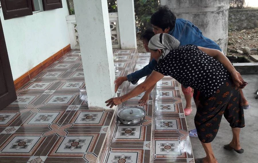 Ông Khuê để chậu nước ở thềm thì nước cũng nóng lên hơn 40 độ C. Những ngày qua, nhiều người dân hiếu kỳ kéo đến nhà ông Khuê để nghe câu chuyện thềm nhà nóng lên và tận tay sờ. Những lúc trời có mưa giông, điểm nóng có hạ nhiệt độ xuống.
