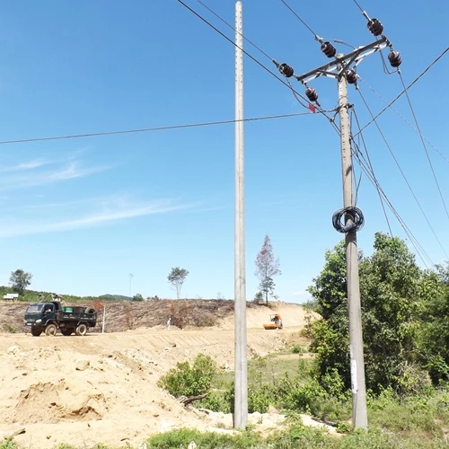 Trong khi chưa tổ chức đấu thầu, chưa di dời trụ điện cũ nhưng Ban Quản lý các dự án chuyên ngành giao thông Phú Yên đã cho thi công trước. Ảnh: TẤN LỘC