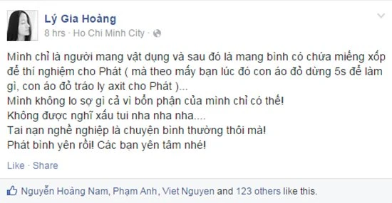 Trong phần biểu diễn của Tấn Phát, cô gái mặc áo đỏ cũng đã lên tiếng trên trang cá nhân (ảnh) về việc cô bị nghi tráo ly nước thành acid: "Mình chỉ là người mang vật dụng và sau đó là mang bình có chứa miếng xốp để thí nghiệm cho Phát (mà theo các bạn lúc đó con áo đỏ dừng 5s để làm gì, con áo đỏ tráo ly axit cho Phát)... Mình không lo sợ gì cả vì bổn phận của mình chỉ có thế".