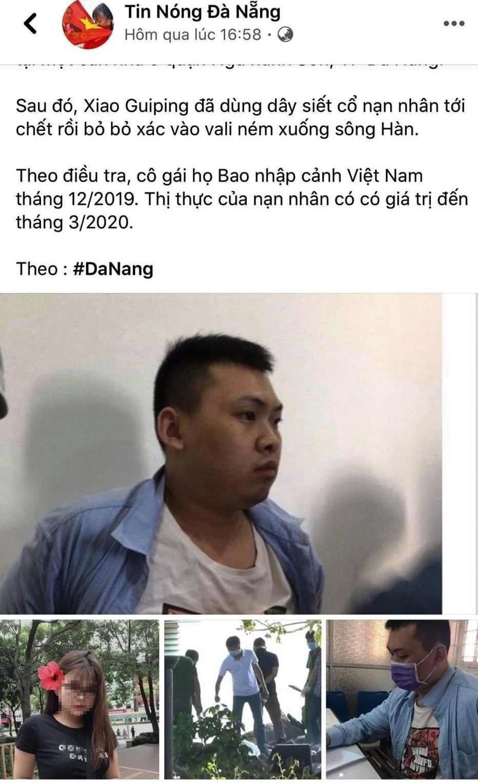 Tại cơ quan công an, Đ. khai ngày 7-2 đọc được thông tin từ một trang mạng xã hội khác về kết quả điều tra vụ án trên kèm hình ảnh một cô gái được cho là nữ nạn nhân người Trung Quốc. Đ. sao chép toàn bộ nội dung và hình ảnh trên đăng lên trang “Tin Nóng Đà Nẵng” do mình làm admin để câu like, câu view.
