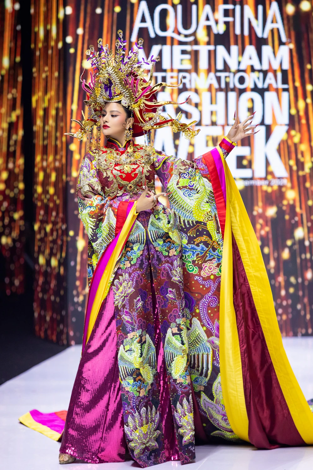Siêu mẫu Vũ Thu Phương trong bộ trang phục khoảng 40kg của NTK Lê Long Dũng. Ảnh: BTC