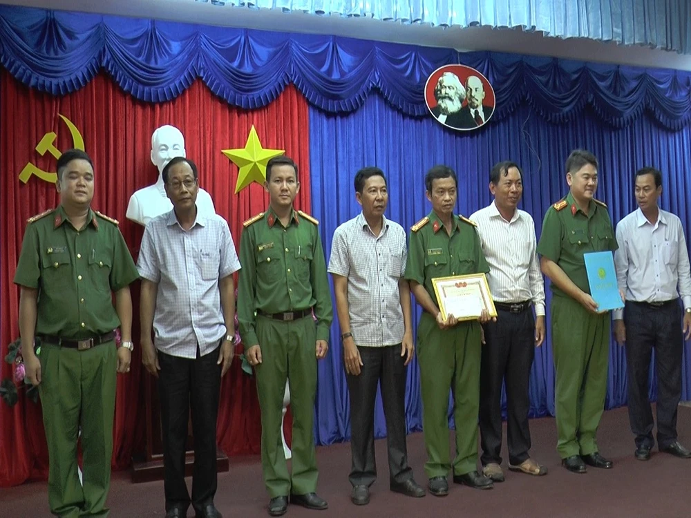 Lãnh đạo huyện Đầm Dơi thưởng nóng cho công an vì thành tích phá án vụ trộm tôm (CTV).