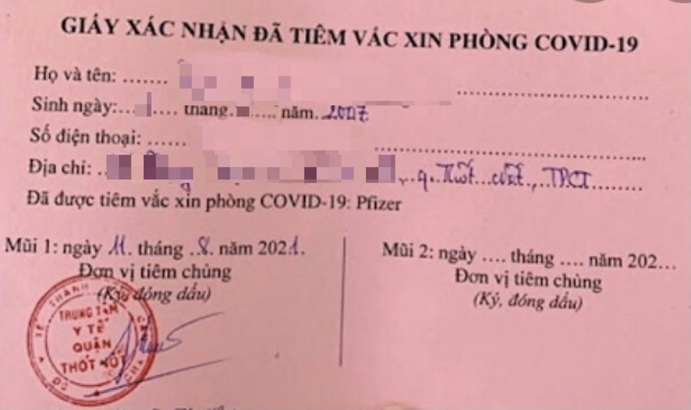 Y sĩ Q. là thành viên đội tiêm vaccine của quận, có ý kiến xin TTYT quận cho cháu ruột là bé gái trên được tiêm vaccine vì ở chung nhà, nguy cơ lây nhiễm cao. Vì vậy TTYT đã đồng ý và tiêm cho cháu hai mũi như giấy xác nhận. Trong khi quận và TP chưa có chủ trương tiêm vaccine phòng COVID-19 cho đối tượng tiêm dưới 18 tuổi.