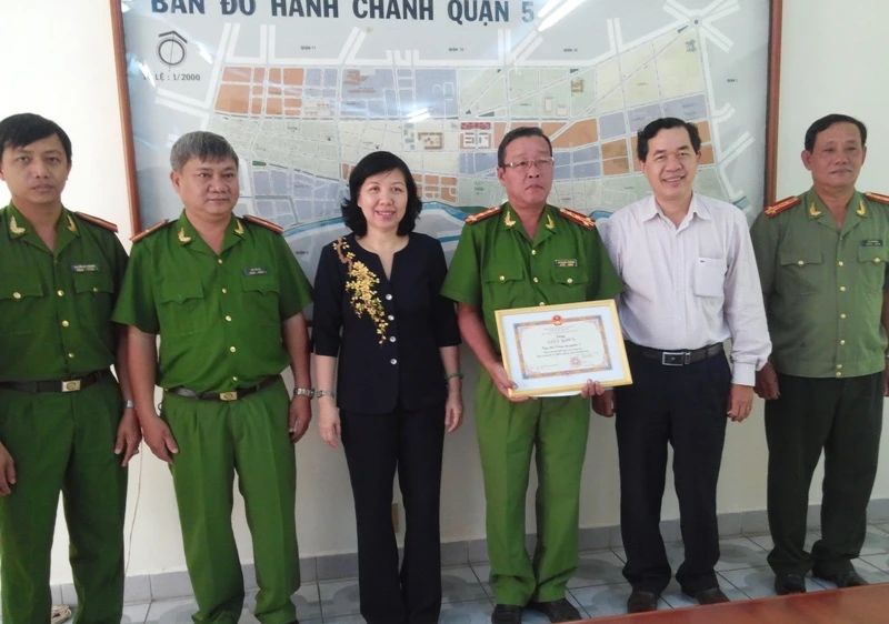 Ông Sử Ngọc Anh Bí thư quận uỷ quận 5 và bà Huỳnh Thị Thảo chủ tịch UBND quận 5 đã thay mặt Đảng uỷ, UBND quận trao quyết định khen thưởng tập thể công an quận 5. Ảnh: Tuyết Khuê