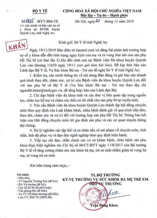 Ngay sau khi cháu bé tử vong, ngày 20-11, Bộ Y tế đã có công văn khẩn gửi Sở Y tế tỉnh Nghệ An yêu cầu làm rõ vụ việc và báo cáo lên Bộ.