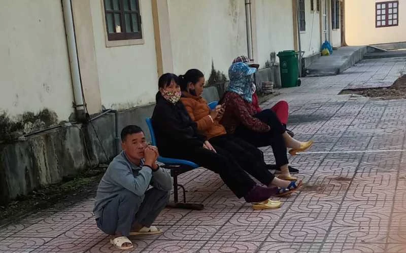 Người thân đang ngồi trong khuôn viên BV Đa khoa huyện Quỳnh Lưu yêu cầu làm rõ vụ việc hai mẹ con chị M. tử vong.