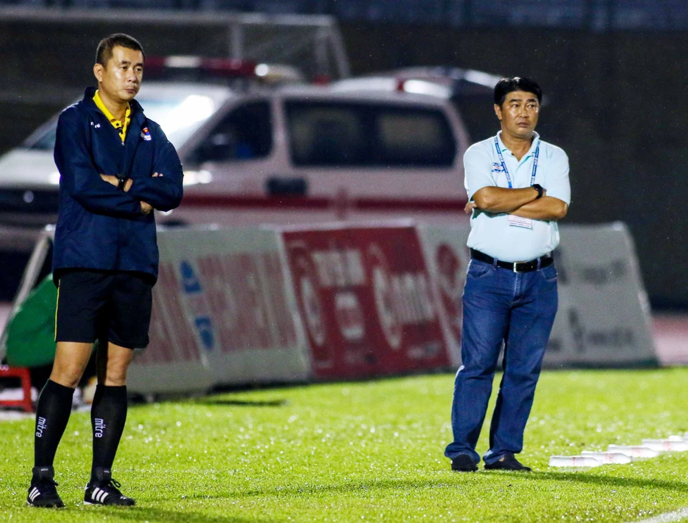 Trọng tài thứ tư Nguyễn Trọng Thư và HLV Trần Minh Chiến.