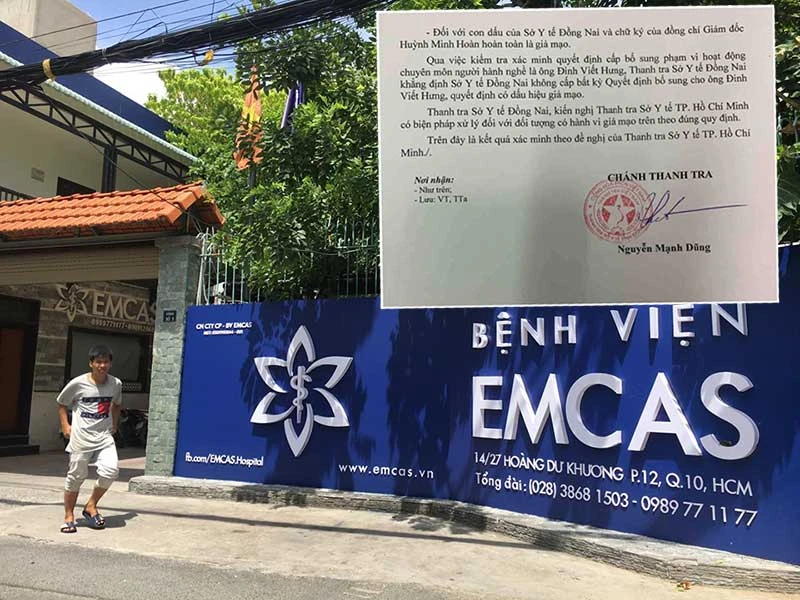 BV thẩm mỹ Emcas, nơi BS Đinh Viết Hưng hợp tác chuyên môn. Ảnh: HL. Ảnh nhỏ: Văn bản của Sở Y tế tỉnh Đồng Nai trả lời Sở Y tế TP.HCM về quyết định giả mạo của BS Đinh Viết Hưng.