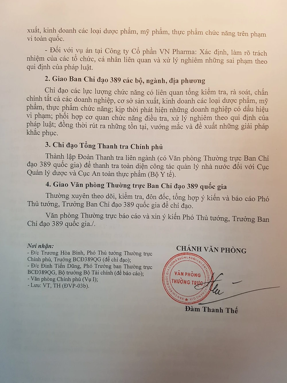 Giao Văn phòng 389 thường xuyên theo dõi, đôn đốc, tổng hợp ý kiến để báo cáo Phó Thủ tướng Thường trực, Trưởng Ban chỉ đạo 389 Quốc gia, để chỉ đạo…