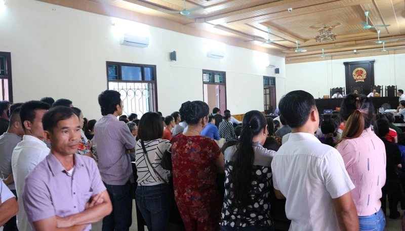 Rất đông người dân đến tham dự phiên tòa, hội trường xét xử không đủ ghế ngồi.