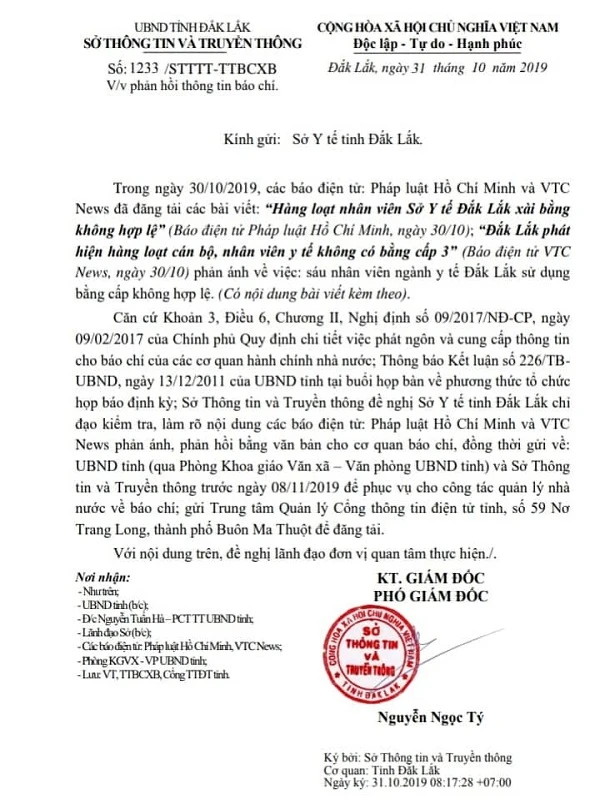 Trong ngày 30-10, PLO có đăng tải bài viết "Hàng loạt nhân viên Sở Y tế Đắk Lắk xài bằng không hợp lệ". Đến ngày 1-11, Sở TT&TT có văn bản phản hồi báo chí, đề nghị Sở Y tế chỉ đạo kiểm tra, làm rõ nội dung mà PLO đã đăng, thông tin bằng văn bản cho cơ quan báo chí, gửi cho UBND tỉnh và Sở TT&TT trước ngày 8-11-2019.