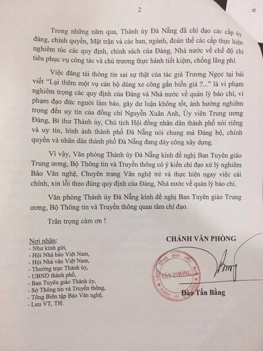 “Vì vậy, Văn phòng Thành ủy Đà Nẵng kính đề nghị Ban Tuyên giáo Trung ương, Bộ TT&TT có ý kiến chỉ đạo xử lý nghiêm báo Văn nghệ, chuyên trang Văn Nghệ Trẻ và thực hiện ngay việc cải chính, xin lỗi theo đúng quy định của Đảng, Nhà nước về quản lý báo chí” - văn bản của Thành ủy Đà Nẵng đề nghị.