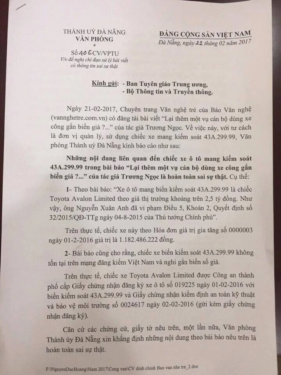 Cũng theo Văn phòng Thành ủy Đà Nẵng, bài báo cũng cho rằng chiếc xe của bí thư Thành ủy Đà Nẵng đi không tồn tại trên mạng đăng kiểm Việt Nam và nghi gắn biển số giả. Thực tế, chiếc xe Toyota Avalon Limited được Công an TP Đà Nẵng cấp giấy chứng nhận đăng ký ô tô số 019225 ngày 1-2-2016 với biển số 43A-299.99 và giấy chứng nhận kiểm định an toàn kỹ thuật và bảo vệ môi trường số 0024617 ngày 2-2-2016.