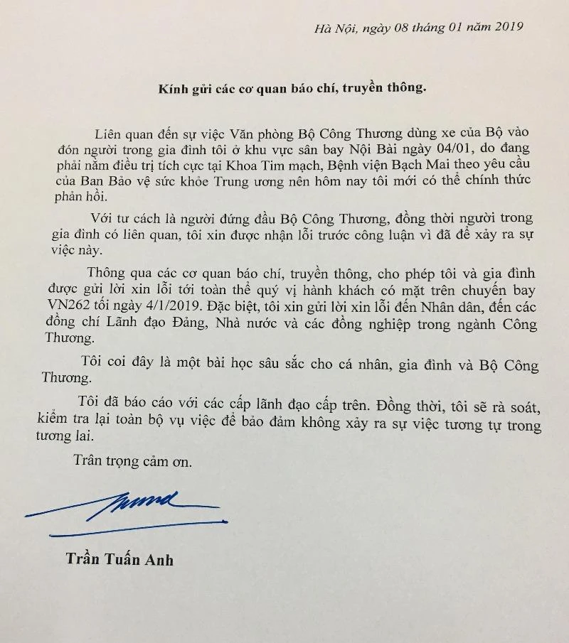 Với tư cách là người đứng đầu Bộ Công thương, đồng thời người trong gia đình có liên quan, tôi xin được nhận lỗi trước công luận vì đã để xảy ra sự việc này. Thông qua các cơ quan báo chí, truyền thông, cho phép tôi và gia đình được gửi lời xin lỗi tới toàn thể quý vị hành khách có mặt trên chuyến bay VN262 tối ngày 4-1-2019.