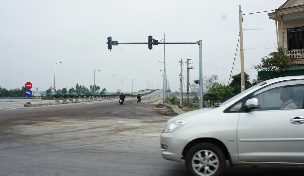 Đèn tín hiệu giao nút giao nhau giữa quốc lộ 1A (km 468 + 850) và đoạn nối quốc lộ 8B (thị trấn Xuân An, huyện Nghi Xuân, Hà Tĩnh) đã lắp đặt nhưng hoạt động phập phù khiến các phương tiện “mạnh ai” nấy chạy. Ảnh: ĐẮC LAM