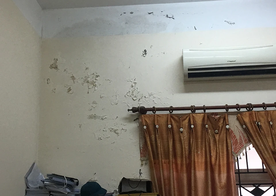 Cũng theo ông Tuấn, các thiết bị vệ sinh ở tầng 4 và tầng 6 sử dụng 10 năm rồi. "Nói thật, đã có nhiều tầng bốc mùi, nhất là mùa nắng hanh khô thì mùi kinh khủng lắm! Riêng đối với nền của tòa nhà, các đầu gạch bị co móp bung cả tảng lên vào mùa nóng nhưng không có gạch để thay thế, cứ mua gạch linh tinh lát vào. Tường của các phòng cũng đã thấm dột”.