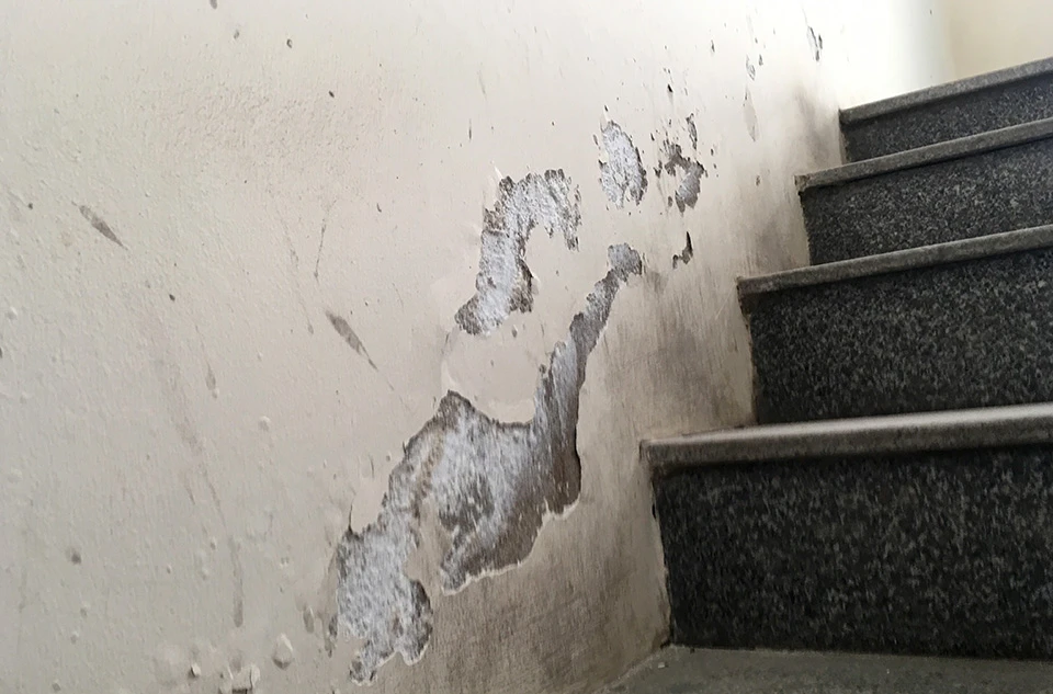 Sơn bong tróc phía cầu thang bộ ở tầng 3 của tòa nhà. Ảnh: Đ.TRUNG